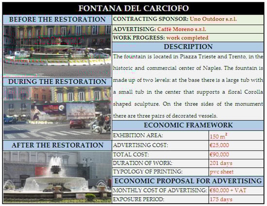 The above model was applied to Caffè Moreno s.r.l., a company active in cultural sponsorships through its participation in the Monumentando Napoli project (Italy). Through this initiative, the City of Naples sought interested parties to enter into a technical sponsorship contract for the restoration of some monuments of the city. In particular, Caffè Moreno s.r.l. funded the restoration of the “Fontana del Carciofo” in Piazza Trieste e Trento.