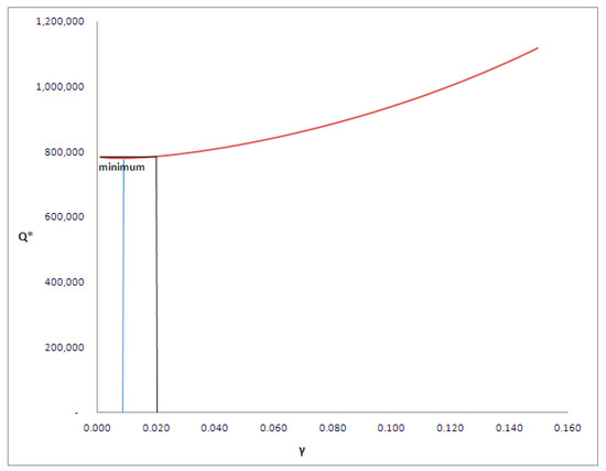 The variation laws of Q* and πmax at the variation of γ have a behavior similar to that of S*, albeit with some differences. In fact, these two functions have a minimum point; for this reason, for values of γ very close to 0, Q* and πmax increase rather than decrease. In particular, these two functions, for γ = 0, will be equal to: Q* = 785,758 kg = Q and πmax = 1,601,865 €. Instead, for γ → 1 both Q* and πmax tend to +:.