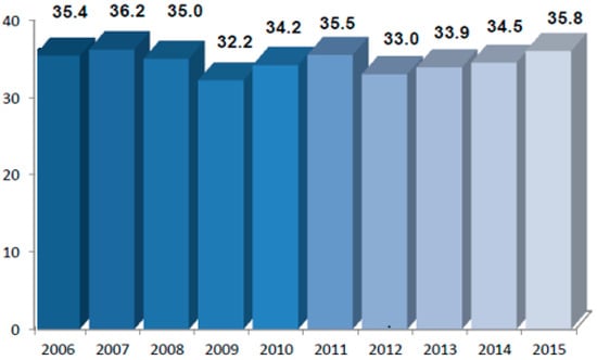The European global glass production for 2006–2015, reported in Figure 1, shows that after a drop in production in 2009 (32.2 Mt), it is currently at almost the same level as it was 10 years ago (around 36 Mt).