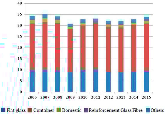 European evolution of glass production by sector (2006–2015) (Mt) [21].