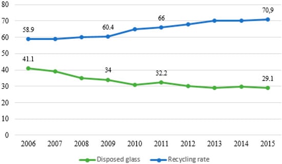 Recycling rate of waste from glass packaging (2006–2015) (%) [53].