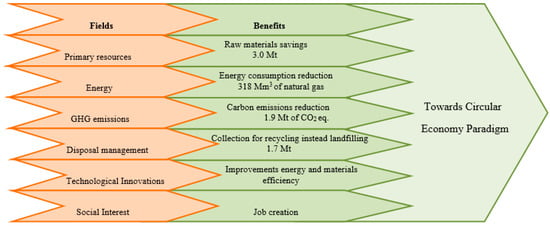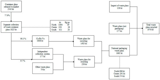 Figure 4 highlights the common waste sorting and recycling framework adopted in Italy [47], and recent studies have shown real energy and environmental benefits in recycling some types of packaging waste, among which is glass [48,49].