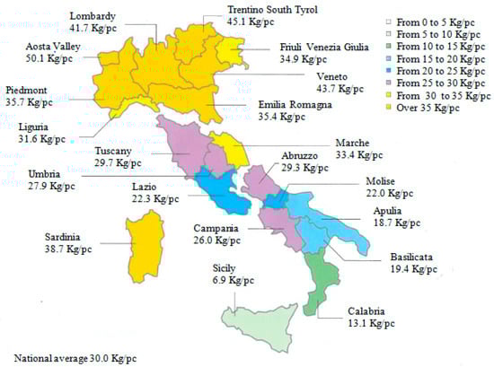 Regional data (kg/pc) of recycled glass packaging waste in Italy (2015) [55].