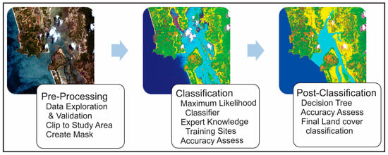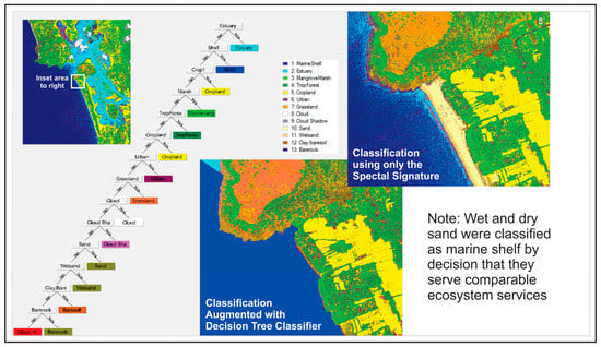 We combined the SMACC tool output and the ocean and estuary masks to build a decision tree classifier (DTC) to limit the spatial and reflectance outliers. The original scene was reclassified using the DTC script. The inputs were defined as the following bands in the decision work flow (Figure 4). The final eight-biome image was assessed for accuracy using a confusion matrix, a simple way of presenting an accuracy assessment of a remotely sensed image [75]. The matrix separates errors of omission (i.e., Producer’s Accuracy—the number of pixels correctly classified in a particular category as a percentage of the total number of pixels actually belonging to that category in the image) from errors of commission (i.e., User’s Accuracy—the number of correctly classified pixels to the total number of pixels assigned to a particular category). The reference dataset was a systematic point grid of our ground-based observations and photointerpretation by local experts. The overall accuracy of the WorldView-3 imagery was 75% and the Landsat 8 imagery was 78%.