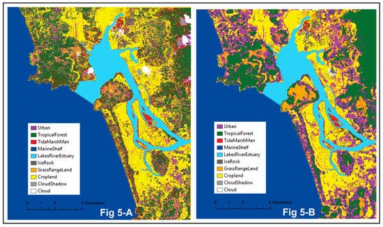 Final land cover classification: (A) results from WorldView-3; and (B) results from Landsat 8.
