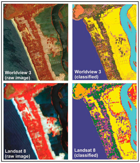 Additionally, land-cover classification from more coarse-resolution imagery (more economical or free for larger extents of analysis) typically results in lower values [85] as high-value but rare biomes (e.g., mangrove wetlands) are often less visible in coarse-resolution imagery. However, in our case, we observed a decrease in calculated value at the higher resolution. The Landsat 8 image identifies more urban area (with an associated ES value of $6661 per hectare per year), whereas the WorldView-3 imagery identified relatively more cropland (valued at $5567 per hectare per year) (Figure 6). This partly results from land use patterns in this region where many small properties have multiple land cover types; at the 30 m spatial resolution of Landsat 8, many pixels that are a mix of roads, small gardens, field, tree plantations, and human settlements become identified as “urban.” We note that this rural environment is fairly densely populated. More than 60,000 people live in villages bordering the river estuary alone, and we estimate more than 115,000 humans live in roughly 100 square kilometers of land in these images. This density would warrant the classification of “urban” in many schemes. The density also exceeds that of many urban-suburban metropolitan areas in the United States and Europe.