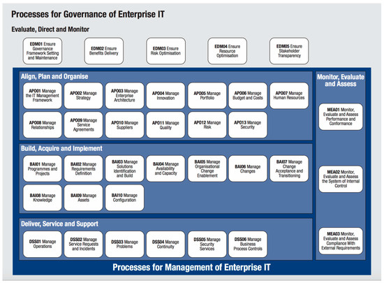 - Information Systems Audit and Control Association (ISACA). COBIT 5: A Business Framework for the Governance and Management of Enterprise IT; ISACA: Rolling Meadows, IL, USA, 2012. [Google Scholar]