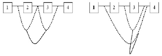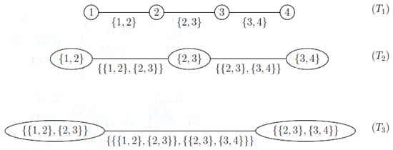 Figure 4 shows an R-Vine on 4 variables, and is sourced from Dissman [28]. The node names appear in the circles in the trees and the edge names appear below the edges in the trees. Given that an edge is a set of two nodes, an edge in the third tree is a set of a set. The proximity condition can be seen in tree , where the first edge connects the nodes and , plus both share the node 2 in tree .