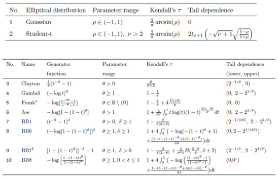 - Patton, A.J. Copula based models for financial time series. In Handbook of Financial Time Series; Springer: Berlin/Heidelberg, Germany, 2009; pp. 767–785. [Google Scholar]
