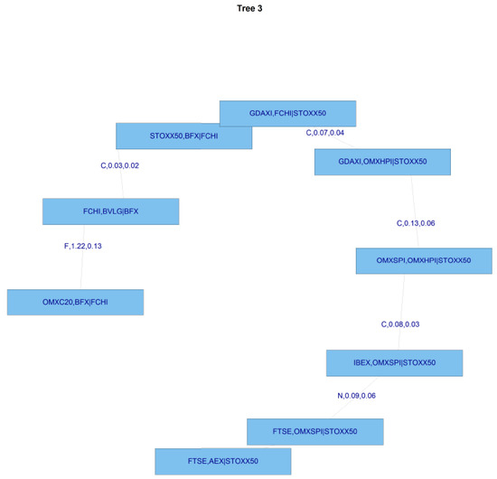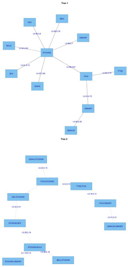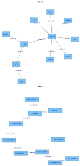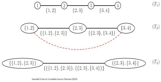 Figure 3 shows an R-Vine on 4 variables, and is sourced from Dissman (2010) [28]. The node names appear in the circles in the trees and the edge names appear below the edges in the trees. Given that an edge is a set of two nodes, an edge in the third tree is a set of a set. The proximity condition can be seen in tree , where the first edge connects the nodes and , and both share node 2 in tree .