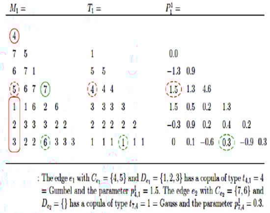 Kurowicka [32] and Dissman [28] have suggested a method of proceeding which involves specifying a lower triangular matrix , with This means that the diagonal entries of M are the numbers in descending order. In this matrix, each row proceeding from the bottom represents a tree, the diagonal entry represents the conditioned set and by the corresponding column entry of the row under consideration. The conditioning set is given by the column entries below this row. The corresponding parameters and types of copula can be stored in matrices relating to M. The following example in Figure 5 is taken from Dissman [28].