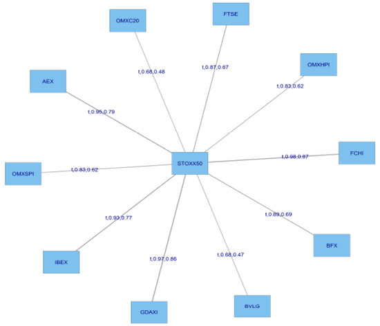 For this C Vine selection, we choose as root node the node that maximizes the sum of pairwise dependencies to this node.We commence by linking all the stocks to the STOXX50 index which is at the centre of this diagram. We use a range of Copulas from for selection purposes; the range being (1:6). We apply AIC as the selection criterion to select from the following menu of copulae: 1 = Gaussian copula, 2 = Student t copula (t-copula), 3 = Clayton copula, 4 = Gumbel copula, 5 = Frank copula, 6 = Joe copula.