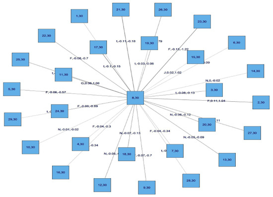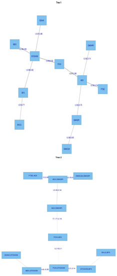Figure 9 shows tree 1 for C-Vine copula estimates in the GFC period, and Figure 10 shows tree 2 for the same period.
