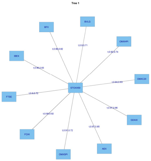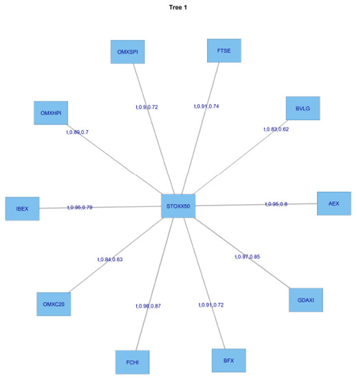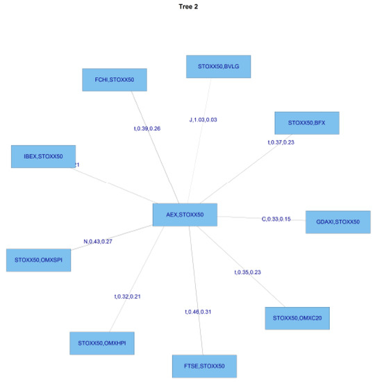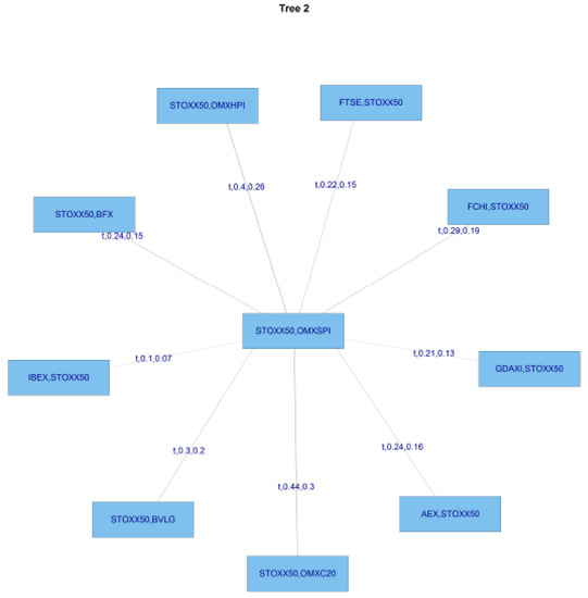 We then compute transformed observations from the estimated pair copulas and these are used as input parameters for the next trees, which are obtained similarly by constructing a graph according to the above C-Vine construction principles (proximity conditions), and finding a maximum dependence tree. The C-Vine tree for period 2 is shown Figure 8.