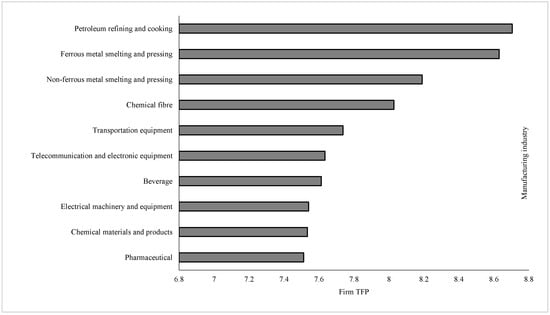 Distribution in the top 10 2-digit GB/T manufacturing industries ordered by firm TFP, over 2005–2007.