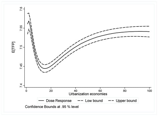 Based on the above analysis, we finally aim to estimate the DRF (dose–response function) as shown in Equation (8) for every level of urbanization economies. In this way, the counterfactual of what R&D performers’ TFP would have been to a given unit had they received a different level of urbanization economies can be answered. To obtain this, first, it is necessary to regress R&D performers’ TFP (outcome) on the urbanization economies (treatment) and estimated GPS as expressed by Equation (7). Table 5 reports the corresponding coefficients. Again, Hirano and Imbens (2004) [47] explain that these estimated results do not have a direct interpretation, and are used to calculate the DRF.