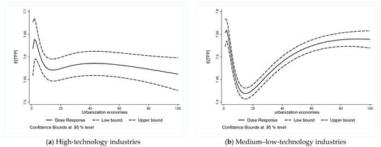 The exploration of urbanization economies–firm TFP nexus in this research focuses on R&D performers in China. Notably, Chinese firms are often described by their lag in the international technology arena behind firms in Western countries. For example, Zeng and Williamson (2007) [52] illustrate that Chinese exporters in high-tech industries may not be effective in catching up with the Western industry leaders, and that technological advancement is still a luxury good for them. Most innovation firms in China employ the cost innovation strategy rather than technological advancement. Considering our data sample as an example, about 16.11% and 83.89% of R&D performers operate in high- and medium–low-technology manufacturing industries, respectively. To explore whether urbanization economies–firm TFP nexus is different across industries with different intensities of technology, we estimate the dose–response function in two groups, as shown in Figure 5: firms operate in high- versus medium–low-technology industries.