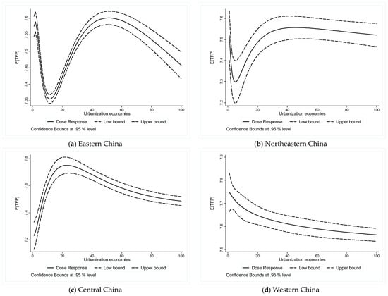 In almost the first 20 years after the adoption of China’s opening-up policy in 1978, Eastern China was given relative development priority to establish strong economic “engines” in this area especially the coastal regions. As such, its agglomeration effects are expected to be larger compared to that in other three regions. In contrast, we expect a higher level of congestion effects in Western China due to its less developed economy. Therefore, to investigate how urbanization economies impact R&D performers’ TFP across different regions, the dose–response function is estimated within Eastern, North East, Central and Western China, respectively.