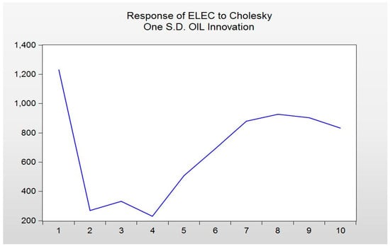 The second graph indicates the response of South Korea’s maximum power demand to the price of oil’s one standard deviation. Initially, it decreased for about 2 weeks, but subsequently increased after 4 weeks. These results confirm previous research.