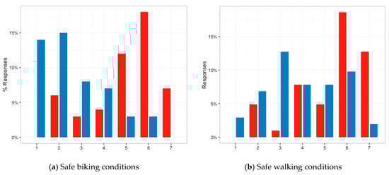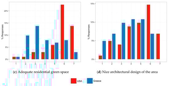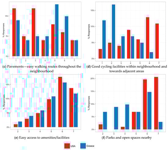 Specifically, the majority of the respondents relocated in areas away from the city center in Greece, but with lower parking availability both in their neighbourhood and at usual destinations outside their neighbourhood (see Figure 1a,b). Moreover, accessibility for the alternative means of transport perceived to be significantly lower in the Greek compared to the US context, both in terms of walkability and of the level of development of cycle facilities in the respondents’ neighbourhood (see Figure 1c,d). Perceived accessibility to neighbourhood’s amenities was quite high in both countries although slightly lower in the Greek compared to the US context (see Figure 1e). Also, respondents stated that Greek relocation areas did not have so many parks and open spaces as the neighbourhoods in the US that they used to live (see Figure 1f). Additionally, respondents stated that the conditions for cycling and walking in Greece are not as safe as they were in the US (see Figure 2a,b), which may also be connected with their statement that the residential green space and architectural environment, including street furniture, were better in the US than in their neighbourhood in Greece (see Figure 2c,d).