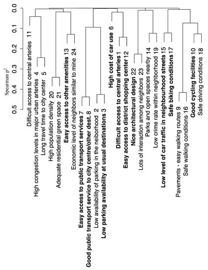 Second, we analysed neighbourhood preferences and travel attitudes of the respondents aiming to identify latent constructs, since many of the questionnaire items are likely to measure similar dimensions of those two factors. Factor analysis was performed using the Likert-scale responses [23] on both neighbourhood preferences and travel attitudes group of items. This method is used to reduce the number of variables in a dataset, by identifying common patterns between them and revealing latent factors. Factor analysis is based on the Spearman statistic test, which is a non-parametric test used for hierarchical cluster analysis [24,25]. Variable clustering is used to assess collinearity and redundancy of the variables, in order to separate them into clusters and treat them as single variables, thus reducing their number. Determining the optimal number of clusters is a key consideration in factor analyses and a topic that has received a lot of attention in the literature, with a large number of criteria proposed (see for example [26,27]). Criteria for determining the optimal number of clusters thus include retaining factors that explain at least 10% of the variance, factors with eigenvalue greater than one, or performing parallel analysis. One complication is that in most applications these criteria lead to different “optimal” numbers of clusters, thus requiring the experience and judgment of the researcher, in order to actually make a decision.