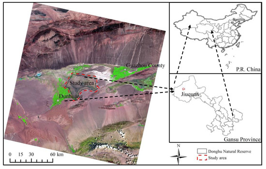 Dunhuang was an important stop on the ancient Silk Road. Today, it is a famous cultural heritage city. This city is located in Northwestern China in the Western Hexi Corridor in Gansu Province; it lies within the triangle formed by Gansu, Qinghai, and Xinjiang Provinces [1,2,3,4,5,6,7,8,9]. In recent decades, the water-based geological and environmental problems of the Dunhuang basin have worsened, as indicated by the decline of its wetlands and the degradation of its vegetation. The Dunhuang Xihu, Nanhu, Beihu, and Donghu Nature Reserves were established to maintain a natural “green barrier” to protect the ecological diversity and environment of the desert oasis [3,4,10]. The Donghu Nature Reserve is located to the east of Dunhuang and near the artificial oasis; it connects between the Guazhou Oasis and the Dunhuang Oasis (Figure 1) and is of considerable importance to the stability of the two oases.