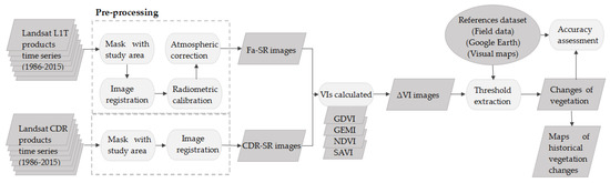 The workflow, shown in Figure 2, primarily includes data preprocessing, evaluation of the FLAASH atmospheric correction, the calculation of the VIs and ΔVIs, the extraction of the vegetation changes based on threshold criteria and the production of maps of the spatio-temporal vegetation changes. These steps are described in detail below.