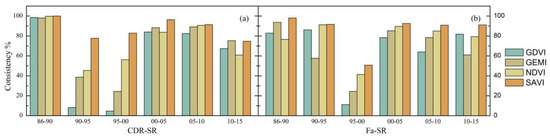 Comparison of the consistency among the four ΔVIs calculated using the CDR-SR images and the Fa-SR images: (a) the percentage of changed pixels produced using the CDR-SR images, where the changed pixels were extracted using the CDR-SR images and the Fa-SR images; (b) the percentage of changed pixels produced using the Fa-SR images, where the changed pixels were extracted using the CDR-SR images and the Fa-SR images. Horizontal axis labels indicate the pairs of the two years used to create the ΔVI images (centuries are not shown).