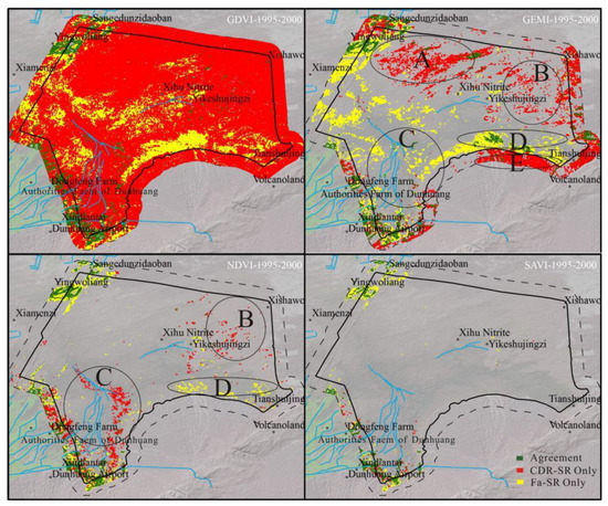 Maps of inconsistencies in the pixels classified as changed for the period of 1995–2000 in the ΔGDVI, ΔGEMI, ΔNDVI, and ΔSAVI images produced using the CDR-SR images and the Fa-SR images. Annotated regions A to E are referred to in the text.
