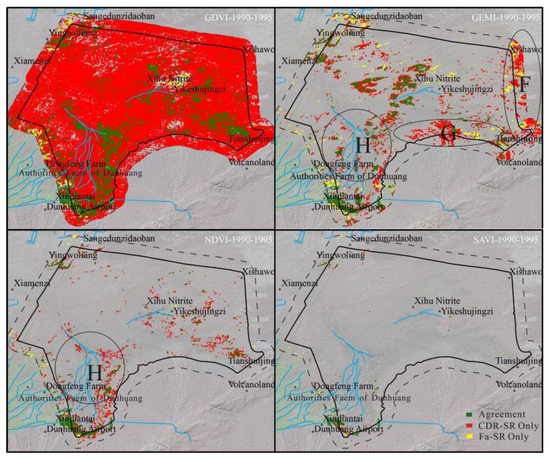 Maps of inconsistencies in the pixels classified as changed for the period of 1990–1995 in the ΔGDVI, ΔGEMI, ΔNDVI, and ΔSAVI images produced using the CDR-SR images and the Fa-SR images. Annotated regions F to H are referred to in the text.