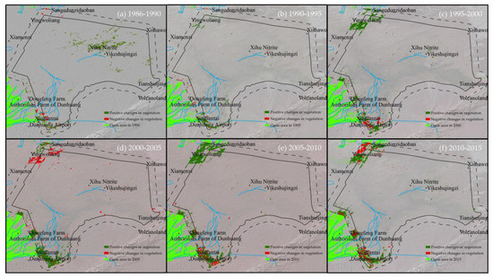 The spatial distribution of vegetation changes that occurred from 1986–2015 in the Donghu Reserve are shown in Figure 6. From 1986 to 1990, the most obvious positive changes in vegetation occurred mainly near Xihu nitrate ore and a smaller number of changes (including positive and negative changes) occurred close to Xindiantai, in the southwestern region of the area (Figure 6a). From 1990 to 1995, the vegetation changes occurred mainly at the edges of artificial oases and were primarily distributed near the southwest corner of the Donghu Reserve (Figure 6b). The vegetation changes (including positive and negative changes) gradually appeared in the protected area during 1995–2000, and a large area of positive changes appeared near Yingwoliang, the terminal area of the Shule River (Figure 6c). From 2000 to 2005, there were a large increase in vegetation near Dongfeng Farm and Xindiantai in the southwest corner of the reserve, whereas the vegetation near Yingwoliang showed a marked decrease (Figure 6d). During 2005–2010, the vegetation showed obvious increases around Yingwoliang and Sangedunzidaoban in the northwest corner of the reserve, and the area of changes in vegetation was larger in this period than that in the previous period (Figure 6e). From 2010–2015, vegetation changes simultaneously occurred near Yingwoliang and Xindiantai, in the northwest and southwest corners of the area (Figure 6f).