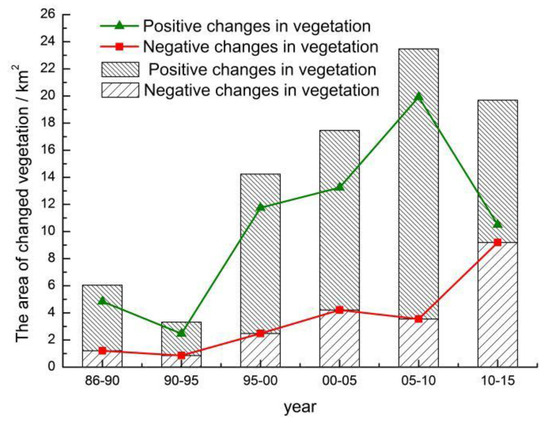 As is shown in Figure 7, the areas reflecting vegetation changes decreased from 1990 to 1995, increased after 1995, and then decreased again until 2010–2015. The positive changes in vegetation showed the same trend as the overall vegetation changes. The area of positive changes was consistently larger than that of negative changes in the period of 1986–2010, whereas the areas of positive and negative changes were similar during 2010–2015. The area of negative changes in vegetation displayed a slight decrease during 1990–1995, increased after 1995, decreased during 2005–2010, and then increased again. However, the positive changes in vegetation dominated the overall trend of changes in vegetation.