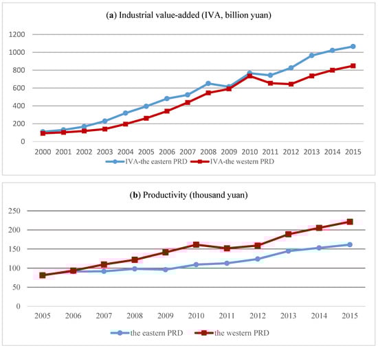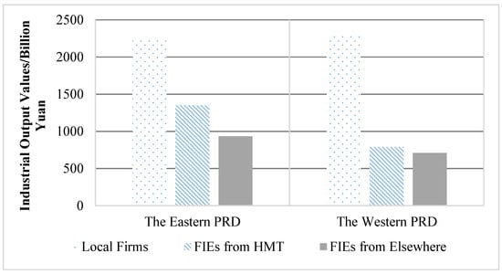 The dependent form of integration of the eastern PRD has caused questions of regional resilience and sustainability. The competitive advantage has been reduced due to land resource exhaustion and serious environmental pollution. As a result, East Asian contract manufacturers, in particular the Taiwanese firms, are relocating their higher value-added segments to the Yangzi River Delta and keeping their PRD production plants at lower value-added segments [,]. In the western PRD, thought local firms have been growing more slowly than the eastern ones, they were catching up quickly in the 2000s. As Figure 3 shows, the total industrial value-added of the western PRD still lagged behind the eastern RPD throughout the 2000s. However, the productivity (the average industrial value-added per enterprise) of the western PRD has outperformed the eastern PRD in 2005 and kept enlarging the gap in the subsequent development.