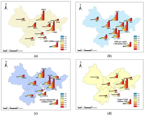 Divergent developmental trajectories of the Pearl River Delta. Sources: Guangdong Statistical Yearbook 1996, 2001, 2010, 2016 [,,,]. (a) GDP from 1980–2015; (b) GDP per capita 1980–2015; (c) Utilized FDI 1980–2015; (d) Export values 1980–2015. Notes: numbers within the figure were data in 2015. Values were at current prices. FDI, foreign direct investment. GDP, gross domestic product.