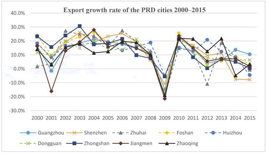 Growth rate of export values in the PRD 2000–2015. Sources: Guangdong Statistical Year Book 2005, 2010, 2016 [,,].