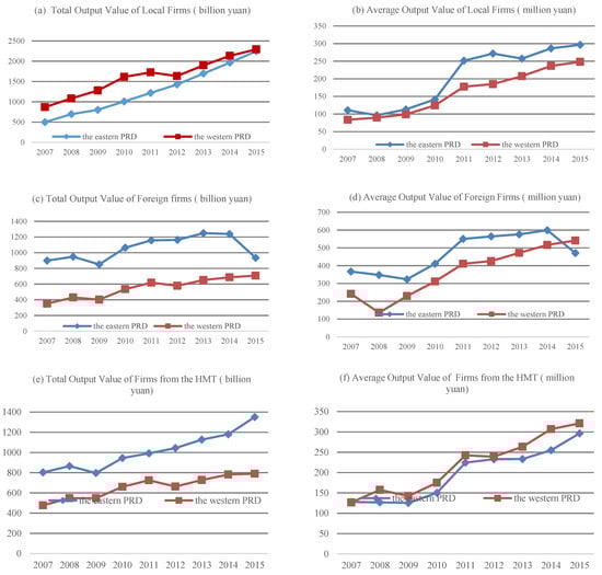 A further examination of different ownerships of firms found that the country origin and location of firms both matter towards the response to the crisis (see Figure 5) (The firm-level data in 2012 were not comparable due to the change of the statistical caliber.). Overall, local firms were less vulnerable than foreign firms to the shock according to the changes of the total and average output values of firms, which is coherent with the traditional understanding that FIEs were leading the regional economies, while local firms were the followers. However, the interesting point is that all types of firms in the western PRD were less vulnerable and more capable of adapting to the shock. However, all types of firms in the eastern PRD recovered soon and took back the momentum of economic growth, which outperformed the western PRD clearly. In terms of local firms, the eastern ones had a drop of average industrial output value from 2009 and 2010, while the western local firms almost outperformed the eastern ones in this period (Figure 5a,b). But local firms in the eastern PRD soared up after 2010. In terms of foreign firms, all had undergone a drop between 2008 and 2009, but the eastern foreign firms apparently had a more significant drop than the western ones between 2008–2009 and 2014–2015 (Figure 5c,d). The performance of Hong Kong, Macao and Taiwan (HMT) firms also showed great divergence (Figure 5e,f). From 2007 to 2011, the output values of the HMT firms in the eastern PRD had a significant drop, while the western PRD was stable and even had a slight increase; since 2008 HMT firms in the western PRD had outperformed the eastern ones and the tendency was reinforced since 2012. Overall, six sub-figure of Figure 5 shows that foreign firms suffered most in the 2008–2009 crisis and performed relatively poorly in more recent development, while local firms and HMT firms were more resilient. In terms of sub-regional difference, firms from the eastern PRD were more resilient than the western ones.