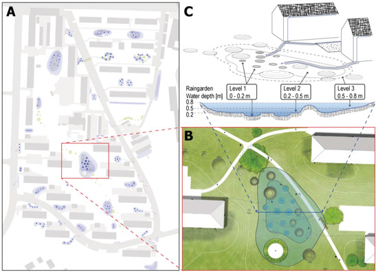 (A) Overview map showing the retention areas with small pools designed for 1/2-year rain events (return period 0.5 year), larger pools for the five-year rain event (return period 5 years) and overflow zones for the 100-year rain event (return period 100 years), where excess soil is used to form small hills that protrude from the temporary ponds in wet conditions; (B) map of one retention zone; and (C) cross-section through the area and 3D-concept illustration.