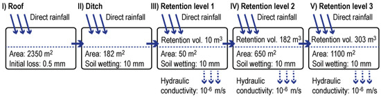 Flow process of rainwater from roof runoff through retention units included in model for calculating water dynamics by means of CREs.