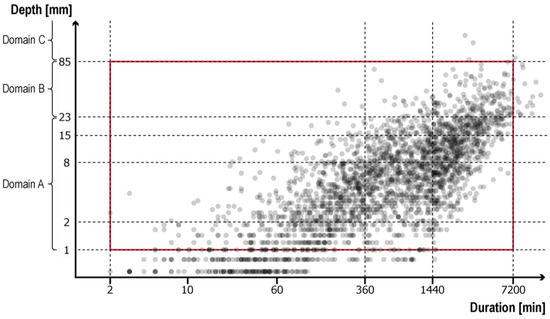 Intersecting rainfall depth intervals with rain event duration intervals yielded the categories that are illustrated with straight dotted lines in Figure 3. Each dot in the figure represents one rain event, plotted as depth versus duration. The figure shows that depth and duration are correlated. The figure also reveals that some categories are more populous than others for each depth interval. Note that four rain events in the time series fall beyond the chosen intervals of depth (they belong to domain C of the 3PA), and 17 events fall beyond the chosen intervals of event duration (they are longer than five days, 7200 min); these events are excluded from the subsequent analyses.