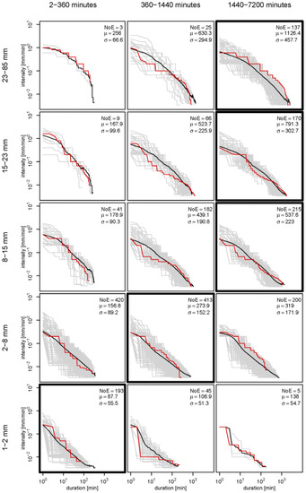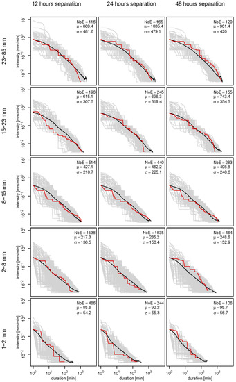 Individual rain events, divided in categories based on rainfall depth (rows) and rain event duration (columns) based on 24 h aggregation threshold, ranked from most to least intense minute. Grey lines represent the historical events in each category, black lines represent the mean intensity event for each category, and red lines represent the historical event that most resembles the mean event of its category. NoE = Number of events; μ = mean event duration; σ = standard deviation of the event duration.