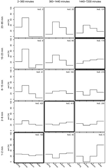 Figure 5 shows all rain events categorized according to both rainfall depth and event duration plotted in the same way as Figure 4. As in Figure 3, this reveals a general trend of depth and duration to be correlated such that deeper events are also longer events. We chose the five final CREs as the CRE of the most populous duration interval within each depth interval, as indicated by the highlighted boxes in the figure, with one exception: for the second depth interval (2–8 mm), the first duration interval is slightly more populous than the second, however all three intervals contains numerous events, and therefore we found that the middle interval is most representative for all three intervals.