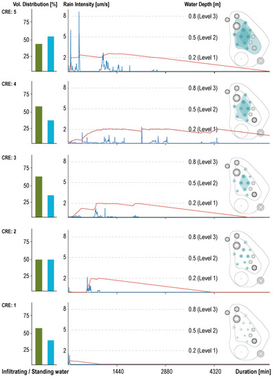 Figure 7 shows that, for CRE 1, the rain falls in a continuous manner for about one hour, and results in a maximum of about 5 cm of visible water in the smallest ponds of the retention area (level 1), with visible water lasting about 10 h in total. The amount of water that at any time during the event becomes visible corresponds to about 40% of the total rainfall volume, with 60% of the water “disappearing” immediately due to wetting and infiltration.