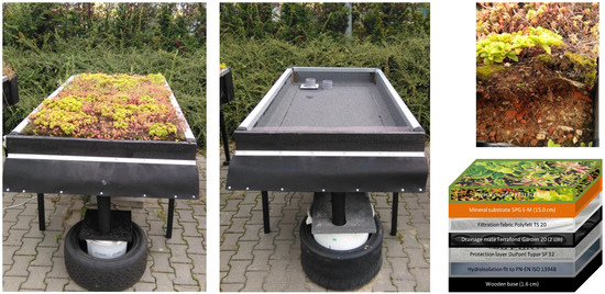 - Pęczkowski, G.; Orzepowski, W.; Pokładek, R.; Kowalczyk, T.; Żmuda, R.; Wójcik, R. Właściwości retencyjne zielonych dachów typu ekstensywnego na przykładzie badań modelowych. Acta Sci. Pol. Formatio Circumiectus 2016, 15, 113–120. [Google Scholar] [CrossRef]