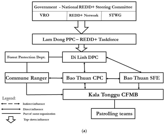 Figure 3 illustrates the forest governance systems in both research sites after REDD+ implementation. In Kala Tonggu, the central government through its REDD+ institutions—Vietnam REDD+ Office (VRO), REDD+ Network and the Sub-Technical Working Groups (STWGs)—was responsible for policy making, technical support and overall management (Figure 3a). Lam Dong province and its REDD+ taskforce were responsible for implementing REDD+ in Di Linh district. The District People’s Committee (DPC), together with its Forest Protection Department (FPD), and in cooperation with Bao Thuan State Forest Enterprise (SFE) and Hieu Commune People’s Committee (CPC), implemented REDD+ and CBFM in Kala Tonggu village. The CFMB of the village protected and monitored the community forest through its patrolling teams. This was done in cooperation with the commune forest rangers.