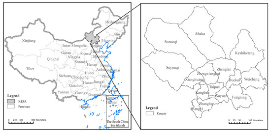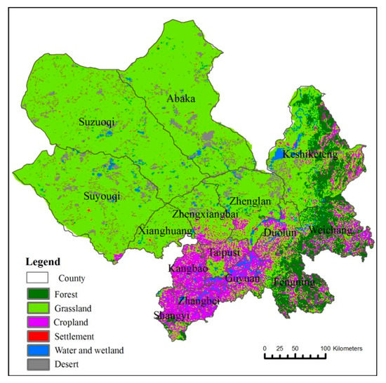 The key ecological function area (KEFA) for the protection of desertification in Hunshandake (which is centred on 43.09°N 114.79°E) is in the middle of Inner Mongolia and northern Hebei Province, China, and it covers an area of 160,000 km2 (Figure 1). It is in the northern Yinshan Mountains and the eastern Mongolian Plateau with an average altitude of 1300 m. The area has an arid to semi-arid and temperate-continental monsoon climate that is characterized by short, warm, dry summers, and long, cold winters. The mean annual temperature is 0~3 °C; the annual precipitation is 350 mm; and, the annual evaporation is 1600 mm. The mean annual wind speed is 4~5 m/s, with maximum values of 24~28 m/s, and the number of days with wind speeds exceeding 17.2 m/s varies from 60 to 80. Furthermore, this area is in the agro-pastoral region of northern China, where the land cover types are primarily grassland and cropland (Figure 2), and it has suffered considerably from desertification due to increased livestock densities and cropland area since the 1980s. The driving factors of desertification include the warm and dry climate and human activity [54], but human activity has been identified as the dominant factor [53,55].