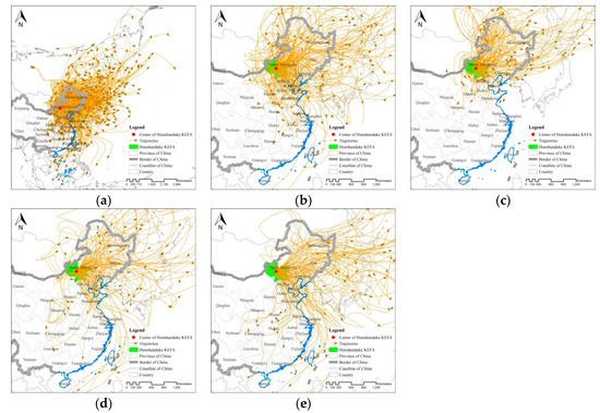 Flow paths of the wind erosion prevented by the ecosystems in the KEFA of Hunshandake. The flow paths represent the trajectories of dust simulated by Hybrid Single-Particle Lagrangian Integrated Trajectory (HYSPLIT) when the wind speeds were ≥5.5 m/s, and they extended over a large area (a). We classified the flow paths in China into four categories: those occurring during spring (b), summer (c), autumn (d) and winter (e).