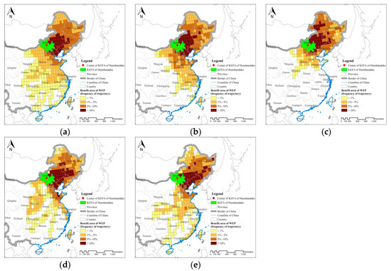 In China, the area that benefitted from the prevention of wind erosion by the ecosystems in the KEFA of Hunshandake was mostly in the eastern part of the country, and it was estimated to be 3.78 × 106 km2, which represents 39.21% of the total area of China. The grid cells through which many (≥10%) of the trajectories passed were mainly in the western part of north-eastern China and the eastern part of northern China, such as eastern Inner Mongolia, Hebei Province and the municipality of Beijing, western Liaoning Province, and Jilin Province (Figure 6a). This result implies that these grid cells received much greater benefits from the wind erosion prevented by the ecosystems in the KEFA of Hunshandake than the other grid cells. As the distance from the KEFA of Hunshandake increased, the benefits accrued to each grid cell tended to gradually decrease. Overall, the grid cells in the southern part of the benefit areas received less benefit than those in the northern part, but the benefitting areas in China varied seasonally. The number of benefitting grid cells was smallest in summer, and most were in north-eastern China and northern China. In spring, the benefitting grid cells extended southward and included eastern China. In autumn and winter, these areas progressively expanded to the southwest, but the eastern part of western China and southern China were also affected (Figure 6b to Figure 6e).
