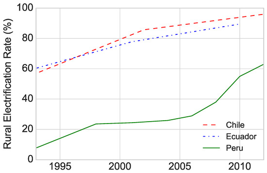 Rural Electrification Rate in Chile, Ecuador, and Peru. Source: Own elaboration based on data from [4,59,60] (for Ecuador data are only available until 2010).