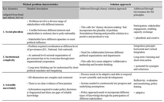 Governance for SD principles could, therefore, act as a facilitating concept that translates the “clumsy” approaches that “wicked problems” call for into components that can be better integrated into the traditional policy cycle. More specifically, they constitute a path to address “wicked problems” within the policy cycle in a slightly more “clumsy” way, while putting additional emphasis on organizational problems, such as cross- and inter-ministerial cooperation and learning. Figure 1 illustrates this relationship between the three “wicked problem” key dynamics, the respective “clumsy” solution approach, and related governance for SD principles as a concrete example thereof.