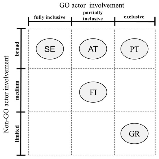 NB: x-axis analysis category “GO (ministry) actor involvement”: Exclusive development (cooperation with only one other ministry); Partially inclusive development (two other ministries); fully Inclusive development (more than 2 ministries); SE was characterised by development process involving all ministries; y-axis analysis category “Non-GO actor involvement” (also including non-ministry government organisations such as local and regional authorities): Limited external involvement (industry; research—public or private; public body—only geological survey); medium external involvement (in addition other public bodies such as regional or local authorities, environmental agencies etc.); Broad external involvement (in addition other CSO stakeholders such as labour associations, environmental and social civil society organisations etc.).